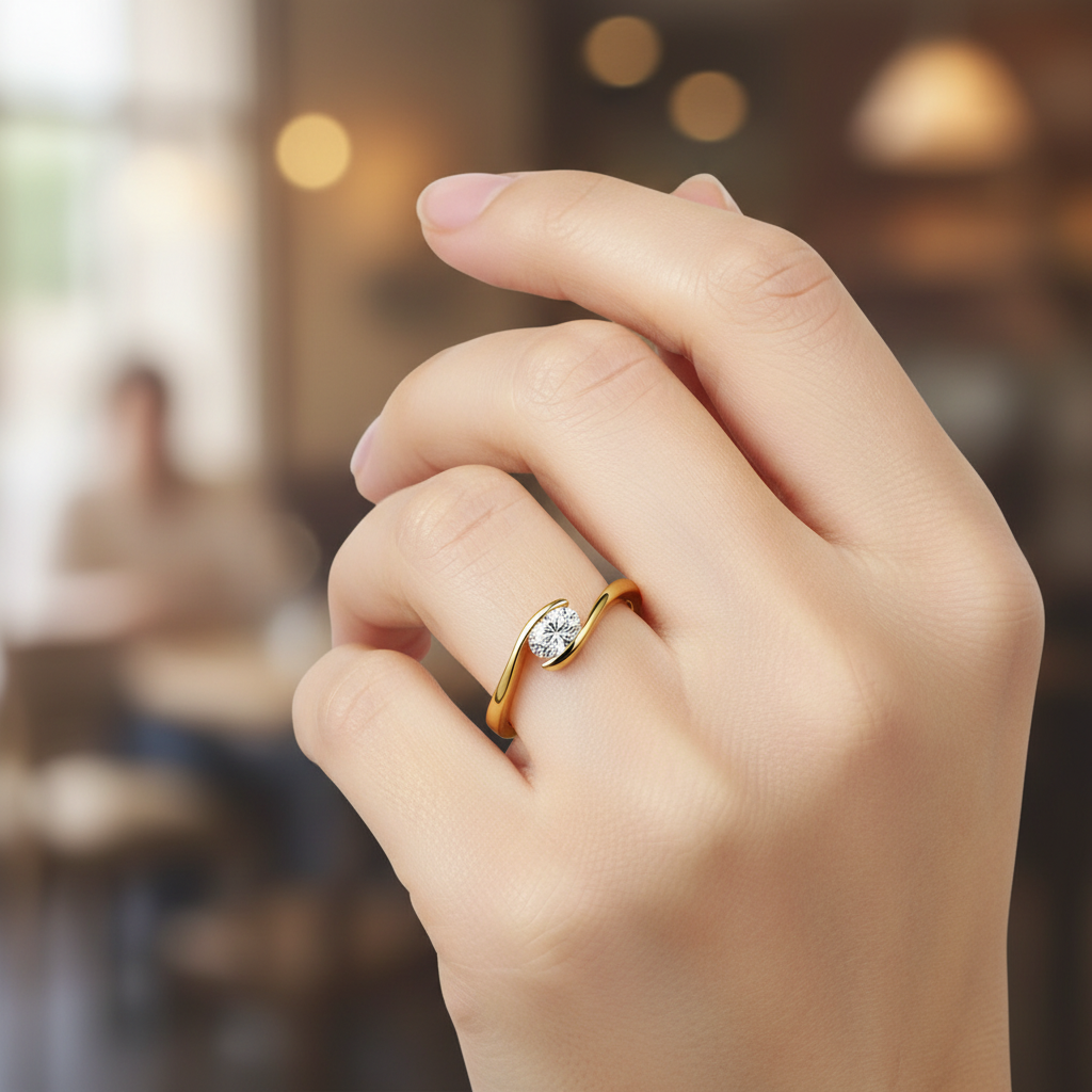 Este anillo de compromiso se distingue por su diseño moderno y envolvente, donde el oro amarillo de 14K parece abrazar con suavidad un brillante diamante de laboratorio de 0.44 ct, con un deseado corte oval, uno de los favoritos de las novias actuales por su elegancia alargada y su destello sutil.